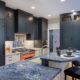 Significant changes to the structure were made to create the dream kitchen that fit the family’s lifestyle. A load-bearing wall was removed, and a massive engineered beam inserted into the ceiling framing opened the kitchen and dining areas. It also allowed for a large island with seating for four, a lower counter area for the son’s baking while the husband used the large, higher portion of the island for making his truffles. With so many special baking appliances and accoutrements, storage was at a premium. Appliance “garages” were added for mixers and other large items while overflow storage was added to the home’s garage. The end result is an open, expansive space filled with natural and artificial light, colorful cabinets, plentiful prep space and storage, high-end appliances, and a mosaic backsplash, which is a nod to the family’s Spanish heritage.